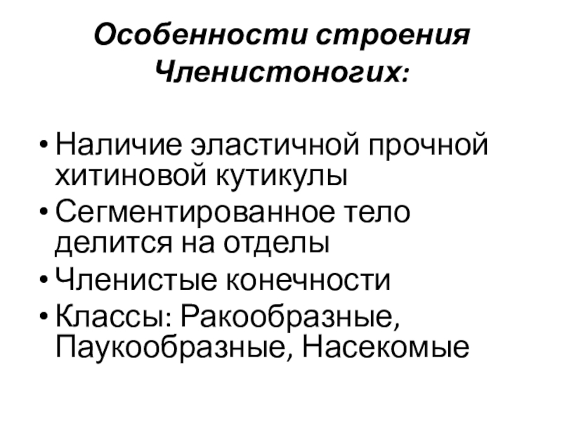 Особенности строения Членистоногих:Наличие эластичной прочной хитиновой кутикулыСегментированное тело делится на отделыЧленистые конечностиКлассы: Ракообразные, Паукообразные, Насекомые