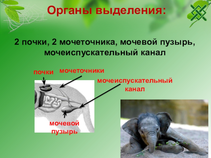Органы выделения:2 почки, 2 мочеточника, мочевой пузырь, мочеиспускательный каналпочкимочеточникимочеиспускательный каналмочевой пузырь