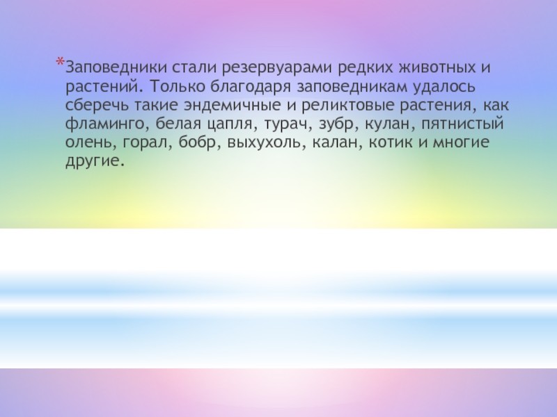 Слайд 30Заповедники стали резервуарами редких животных и растений. Только благодаря заповедникам удалось