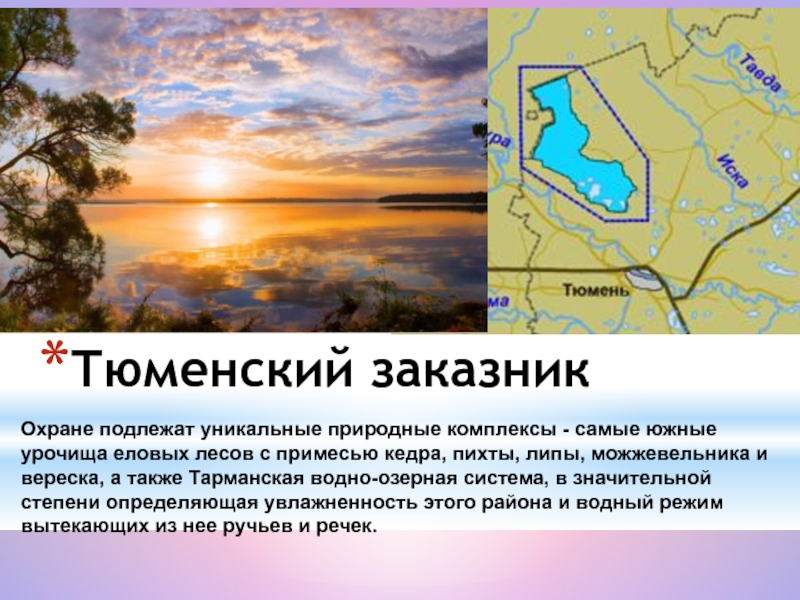 Тюменский заказникОхране подлежат уникальные природные комплексы - самые южные урочища еловых лесов с примесью кедра, пихты, липы,
