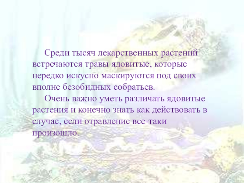 Слайд 2 Среди тысяч лекарственных растений встречаются травы ядовитые, которые нередко искусно маскируются под