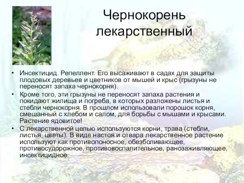 Кроме того, эти грызуны не переносят запаха растения и покидают жилища и погреба, в которых разложены листья и стебли чернокорня. В прошлом использовали порошок корня, смешанный с хлебом и салом, для борьбы с мышами и крысами. Растение ядовитое!