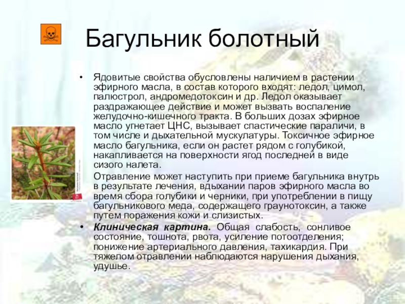 которого входят: ледол, цимол, палюстрол, андромедотоксин и др. Ледол оказывает раздражающее действие и может вызвать воспаление желудочно-кишечного тракта. В больших дозах эфирное масло угнетает ЦНС, вызывает спастические параличи, в том числе и дыхательной мускулатуры. Токсичное эфирное масло багульника, если он растет рядом с голубикой, накапливается на поверхности ягод последней в виде сизого налета.