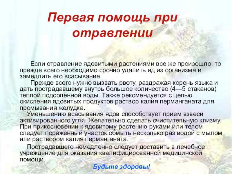 Очень важно уметь различать ядовитые растения и конечно знать как действовать в случае, если отравление все-таки произошло.