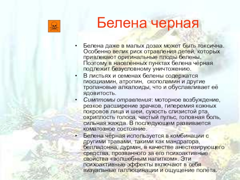 риск отравления детей, которых привлекают оригинальные плоды белены. Поэтому в населённых пунктах белена чёрная подлежит безусловному уничтожению.