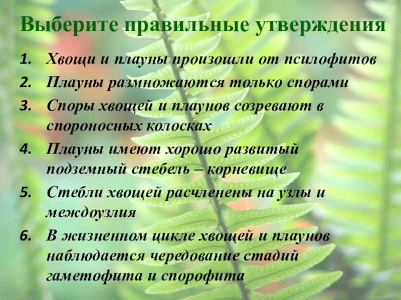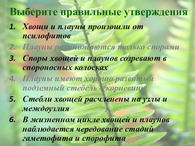 Выберите правильные утвержденияХвощи и плауны произошли от псилофитовПлауны размножаются только спорамиСпоры хвощей и плаунов созревают в спороносных