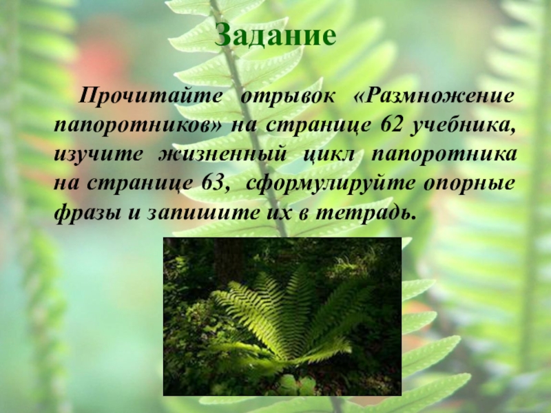 Задание  Прочитайте отрывок «Размножение папоротников» на странице 62 учебника, изучите жизненный цикл папоротника на странице 63,