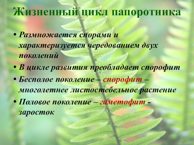 Жизненный цикл папоротникаРазмножается спорами и характеризуется чередованием двух поколенийВ цикле развития преобладает спорофитБесполое поколение – спорофит –