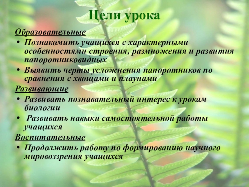 Цели урокаОбразовательныеПознакомить учащихся с характерными особенностями строения, размножения и развития папоротниковидныхВыявить черты усложнения папоротников по сравнения с хвощами и плаунамиРазвивающиеРазвивать познавательный интерес к урокам биологии Развивать навыки самостоятельной работы учащихсяВоспитательныеПродолжить работу по формированию научного мировоззрения учащихся