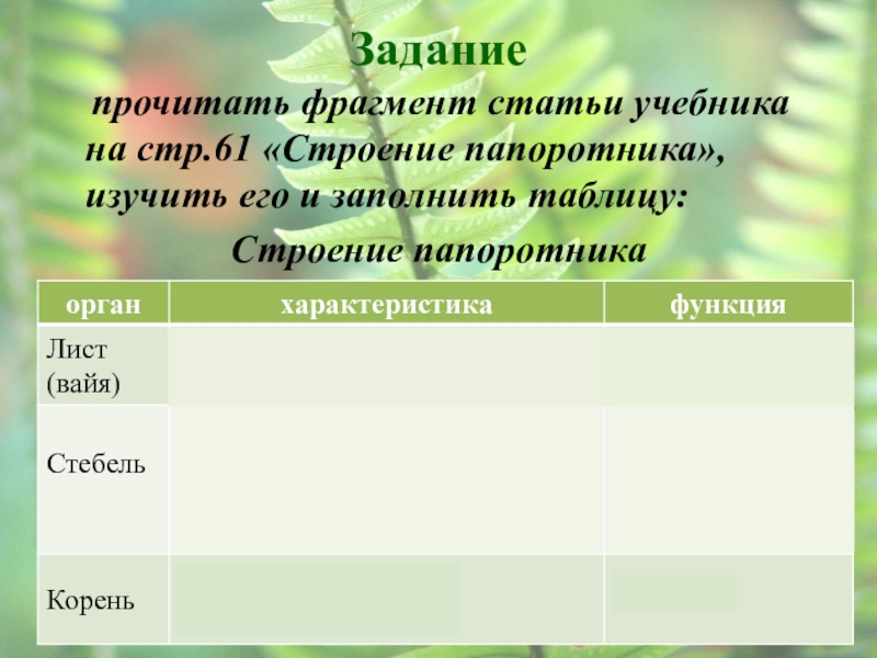 Задание  прочитать фрагмент статьи учебника на стр.61 «Строение папоротника», изучить его и заполнить таблицу:Строение папоротника
