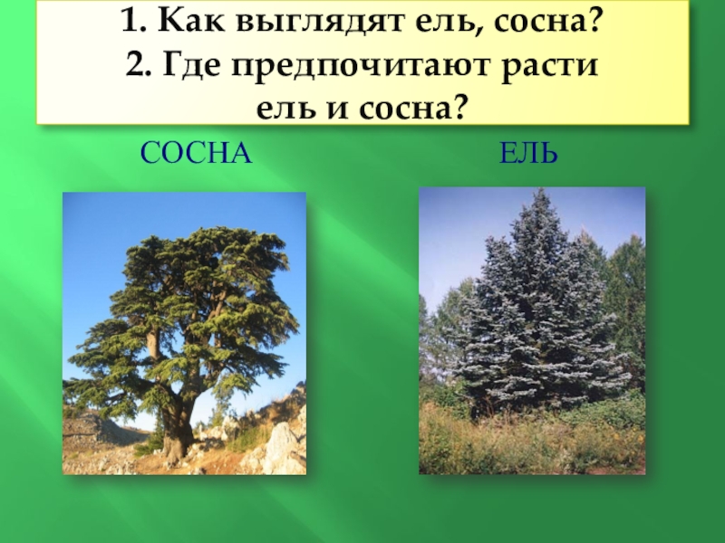 Слайд 111. Как выглядят ель, сосна? 2. Где предпочитают расти ель и сосна?