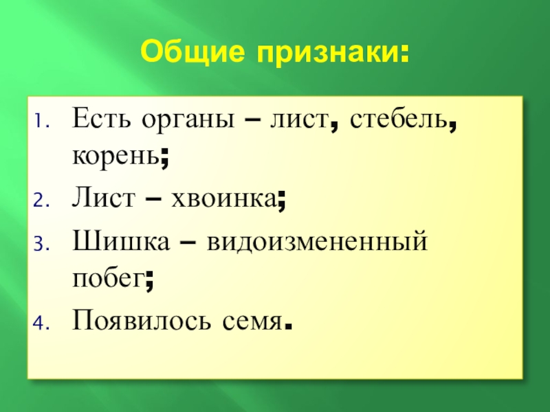 Общие признаки:Есть органы – лист, стебель, корень;Лист – хвоинка;Шишка – видоизмененный побег;Появилось семя.