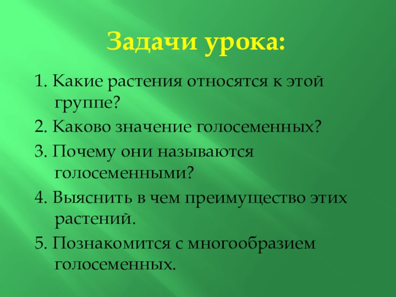 Задачи урока:1. Какие растения относятся к этой группе?2. Каково значение голосеменных?3. Почему они называются голосеменными?4. Выяснить в