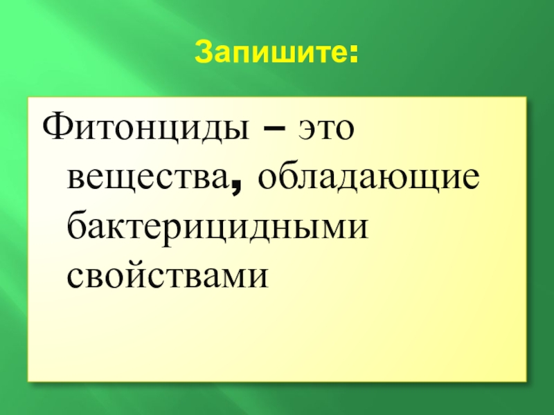 Запишите:Фитонциды – это    вещества, обладающие бактерицидными свойствами
