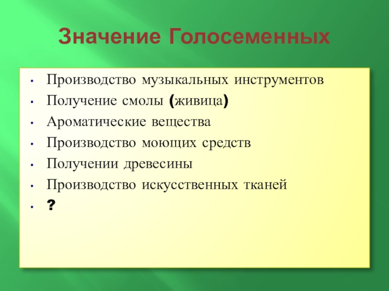 Значение ГолосеменныхПроизводство музыкальных инструментовПолучение смолы (живица)Ароматические веществаПроизводство моющих средствПолучении древесиныПроизводство искусственных тканей?