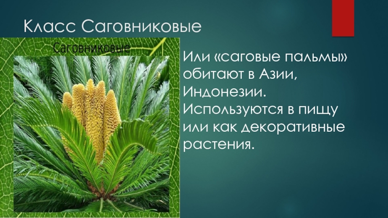 Класс СаговниковыеИли «саговые пальмы» обитают в Азии, Индонезии. Используются в пищу или как декоративные растения.