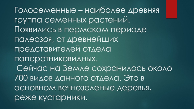 Слайд 3Голосеменные – наиболее древняя группа семенных растений. Появились в пермском периоде