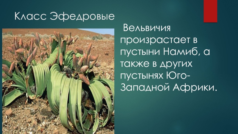 Класс Эфедровые Вельвичия произрастает в пустыни Намиб, а также в других пустынях Юго- Западной Африки.