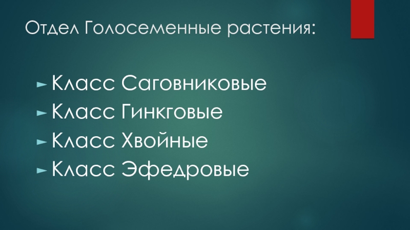 Отдел Голосеменные растения:Класс СаговниковыеКласс ГинкговыеКласс Хвойные Класс Эфедровые