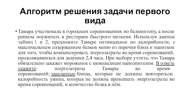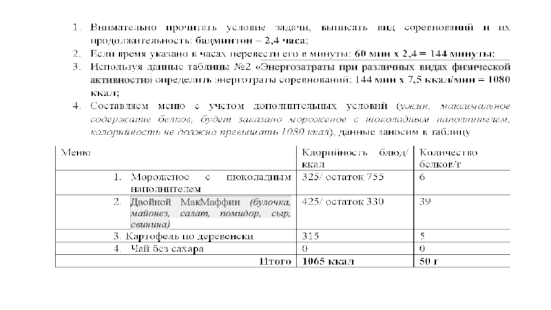 а после решила поужинать в ресторане быстрого питания. Используя данные таблиц 1 и 2, предложите Тамаре оптимальное по калорийности, с максимальным содержанием белков меню из перечня блюд и напитков для того, чтобы компенсировать энергозатраты во время соревнований, продолжавшихся для девушки 2,4 часа. При выборе учтите, что Тамара обязательно закажет мороженое с шоколадным наполнителем. В ответе укажите: энергозатраты Тамары во время соревнований; заказанные блюда, которые не должны повторяться; калорийность ужина, которая не должна превышать энергозатраты во время соревнований, и количество белка в нём.