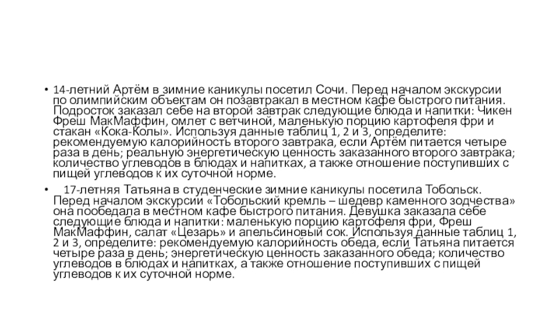 17-летняя Татьяна в студенческие зимние каникулы посетила Тобольск. Перед началом экскурсии «Тобольский кремль – шедевр каменного зодчества» она пообедала в местном кафе быстрого питания. Девушка заказала себе следующие блюда и напитки: маленькую порцию картофеля фри, Фреш МакМаффин, салат «Цезарь» и апельсиновый сок. Используя данные таблиц 1, 2 и 3, определите: рекомендуемую калорийность обеда, если Татьяна питается четыре раза в день; энергетическую ценность заказанного обеда; количество углеводов в блюдах и напитках, а также отношение поступивших с пищей углеводов к их суточной норме.