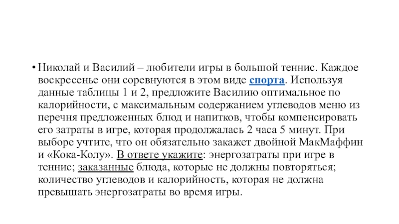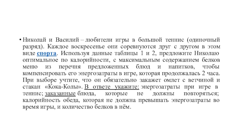 они соревнуются друг с другом в этом виде спорта. Используя данные таблицы 1 и 2, предложите Николаю оптимальное по калорийности, с максимальным содержанием белков меню из перечня предложенных блюд и напитков, чтобы компенсировать его энергозатраты в игре, которая продолжалась 2 часа. При выборе учтите, что он обязательно закажет омлет с ветчиной и стакан «Кока-Колы». В ответе укажите: энергозатраты при игре в теннис; заказанные блюда, которые не должны повторяться; калорийность обеда, которая не должна превышать энергозатраты во время игры, и количество белков в нём.