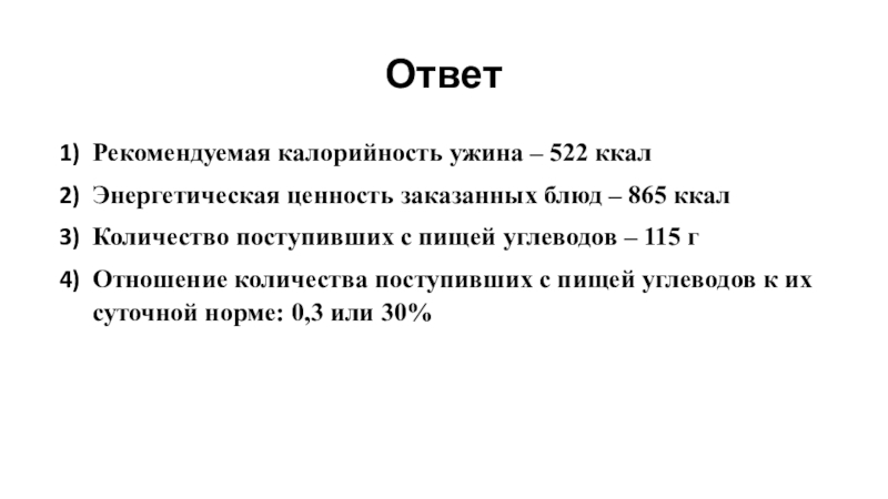 меню. Надо определить:1) рекомендуемую калорийность завтрака, обеда или ужина, при четырехразовом питании, 2) реальную калорийность заказанного меню, и 3) количество поступивших с пищей белков, жиров или углеводов к их суточной норме