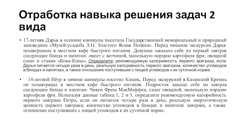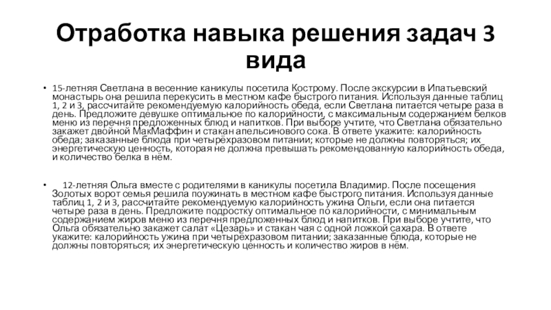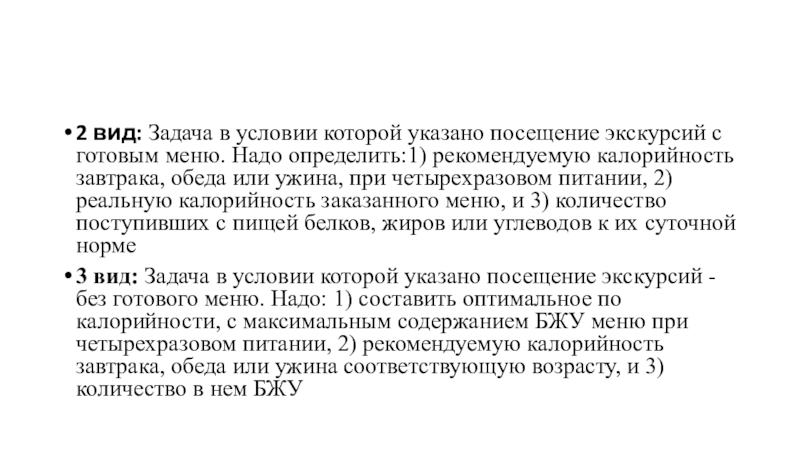 3 вид: Задача в условии которой указано посещение экскурсий - без готового меню. Надо: 1) составить оптимальное по калорийности, с максимальным содержанием БЖУ меню при четырехразовом питании, 2) рекомендуемую калорийность завтрака, обеда или ужина соответствующую возрасту, и 3) количество в нем БЖУ