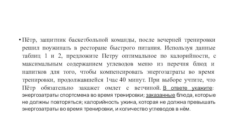 Слайд 13Пётр, защитник баскетбольной команды, после вечерней тренировки решил поужинать в ресторане