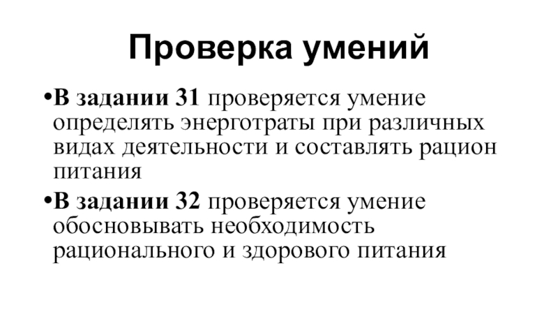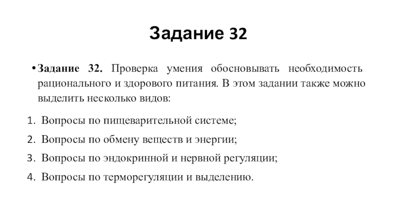 В задании 32 проверяется умение обосновывать необходимость рационального и здорового питания
