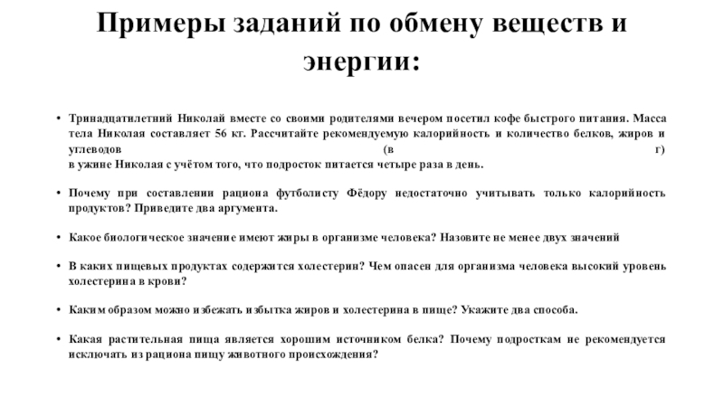 Слайд 31Примеры заданий по обмену веществ и энергии: