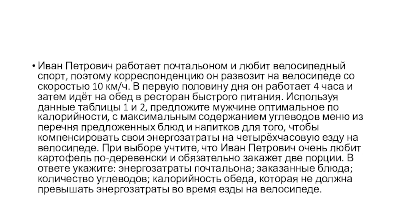 развозит на велосипеде со скоростью 10 км/ч. В первую половину дня он работает 4 часа и затем идёт на обед в ресторан быстрого питания. Используя данные таблицы 1 и 2, предложите мужчине оптимальное по калорийности, с максимальным содержанием углеводов меню из перечня предложенных блюд и напитков для того, чтобы компенсировать свои энергозатраты на четырёхчасовую езду на велосипеде. При выборе учтите, что Иван Петрович очень любит картофель по-деревенски и обязательно закажет две порции. В ответе укажите: энергозатраты почтальона; заказанные блюда; количество углеводов; калорийность обеда, которая не должна превышать энергозатраты во время езды на велосипеде.