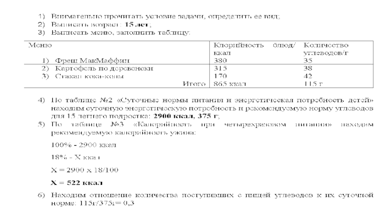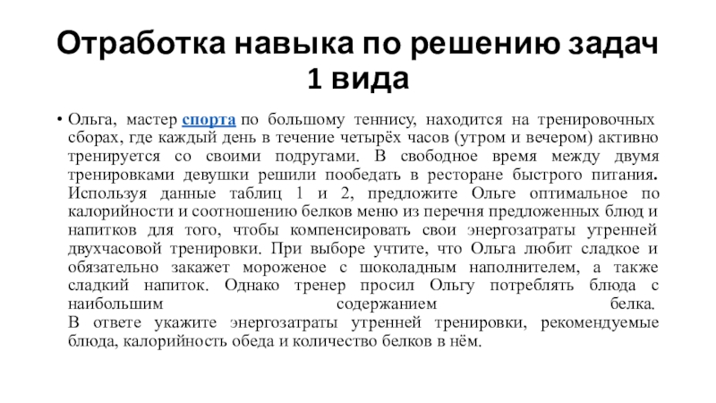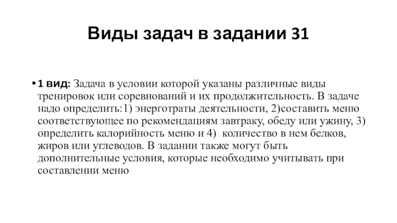 различные виды тренировок или соревнований и их продолжительность. В задаче надо определить:1) энерготраты деятельности, 2)составить меню соответствующее по рекомендациям завтраку, обеду или ужину, 3)определить калорийность меню и 4) количество в нем белков, жиров или углеводов. В задании также могут быть дополнительные условия, которые необходимо учитывать при составлении меню