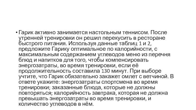 в ресторане быстрого питания. Используя данные таблиц 1 и 2, предложите Гарику оптимальное по калорийности, с максимальным содержанием углеводов меню из перечня блюд и напитков для того, чтобы компенсировать энергозатраты, во время тренировки, если её продолжительность составила 130 минут. При выборе учтите, что Гарик обязательно закажет омлет с ветчиной. В ответе укажите: энергозатраты спортсмена во время тренировки; заказанные блюда, которые не должны повторяться; калорийность завтрака, которая не должна превышать энергозатраты во время тренировки, и количество углеводов в нём.