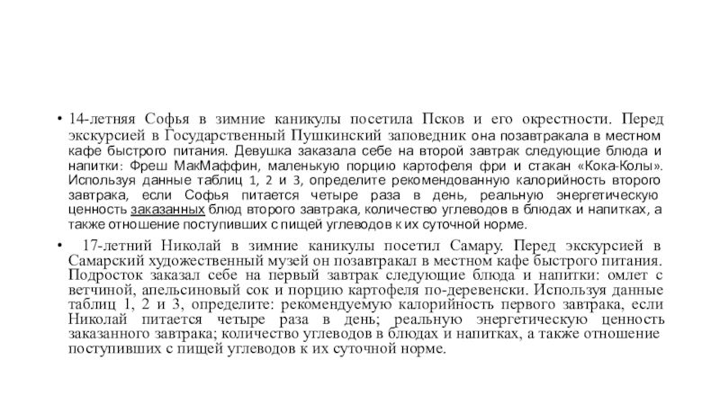 14-летний Пётр в зимние каникулы посетил Казань. Перед экскурсией в Казанский Кремль он позавтракал в местном кафе быстрого питания. Подросток заказал себе на завтрак следующие блюда и напитки: Чикен Фреш МакМаффин, салат овощной, маленькую порцию картофеля фри. Используя данные таблиц 1, 2 и 3, определите рекомендуемую калорийность первого завтрака Петра, если он питается четыре раза в день; реальную энергетическую ценность первого завтрака; количество углеводов в блюдах и напитках завтрака, а также отношение поступивших с пищей углеводов к их суточной норме.