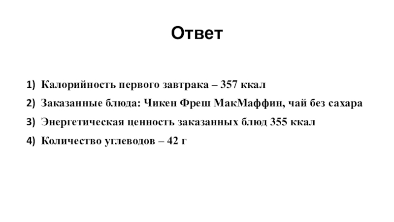 олимпийским объектам он позавтракал в местном кафе быстрого питания. Подросток заказал себе на второй завтрак следующие блюда и напитки: Чикен Фреш МакМаффин, омлет с ветчиной, маленькую порцию картофеля фри и стакан «Кока-Колы». Используя данные таблиц 1, 2 и 3, определите: рекомендуемую калорийность второго завтрака, если Артём питается четыре раза в день; реальную энергетическую ценность заказанного второго завтрака; количество углеводов в блюдах и напитках, а также отношение поступивших с пищей углеводов к их суточной норме.