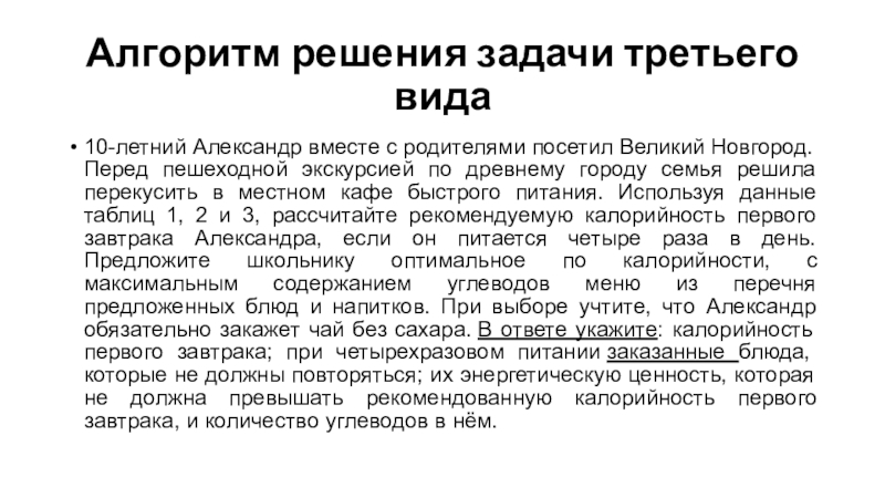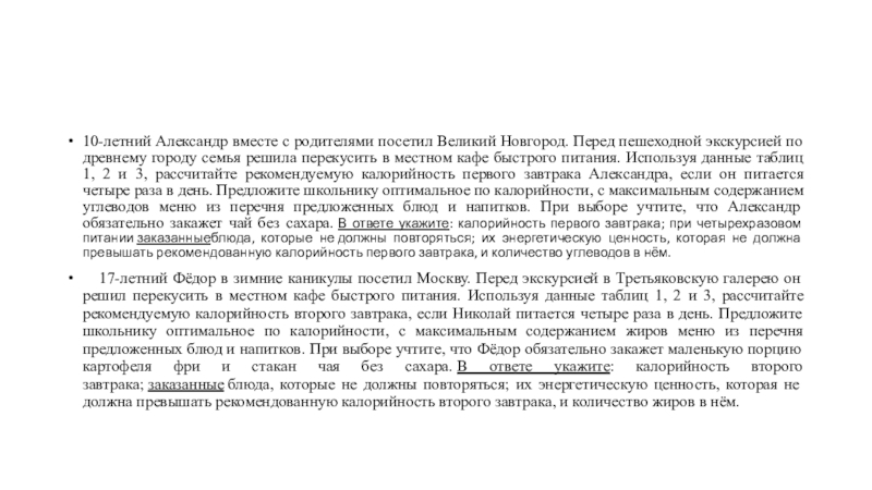 Новгород. Перед пешеходной экскурсией по древнему городу семья решила перекусить в местном кафе быстрого питания. Используя данные таблиц 1, 2 и 3, рассчитайте рекомендуемую калорийность первого завтрака Александра, если он питается четыре раза в день. Предложите школьнику оптимальное по калорийности, с максимальным содержанием углеводов меню из перечня предложенных блюд и напитков. При выборе учтите, что Александр обязательно закажет чай без сахара. В ответе укажите: калорийность первого завтрака; при четырехразовом питании заказанные блюда, которые не должны повторяться; их энергетическую ценность, которая не должна превышать рекомендованную калорийность первого завтрака, и количество углеводов в нём.