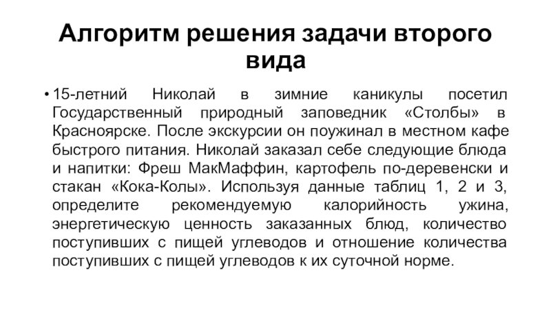 природный заповедник «Столбы» в Красноярске. После экскурсии он поужинал в местном кафе быстрого питания. Николай заказал себе следующие блюда и напитки: Фреш МакМаффин, картофель по-деревенски и стакан «Кока-Колы». Используя данные таблиц 1, 2 и 3, определите рекомендуемую калорийность ужина, энергетическую ценность заказанных блюд, количество поступивших с пищей углеводов и отношение количества поступивших с пищей углеводов к их суточной норме.