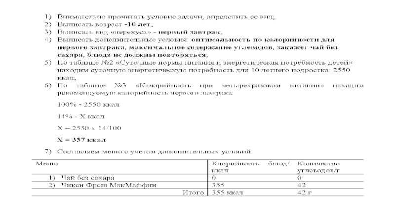 по древнему городу семья решила перекусить в местном кафе быстрого питания. Используя данные таблиц 1, 2 и 3, рассчитайте рекомендуемую калорийность первого завтрака Александра, если он питается четыре раза в день. Предложите школьнику оптимальное по калорийности, с максимальным содержанием углеводов меню из перечня предложенных блюд и напитков. При выборе учтите, что Александр обязательно закажет чай без сахара. В ответе укажите: калорийность первого завтрака; при четырехразовом питании заказанныеблюда, которые не должны повторяться; их энергетическую ценность, которая не должна превышать рекомендованную калорийность первого завтрака, и количество углеводов в нём.