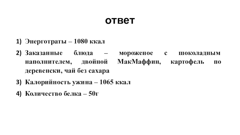 быстрого питания. Используя данные таблиц 1 и 2, предложите Петру оптимальное по калорийности, с максимальным содержанием углеводов меню из перечня блюд и напитков для того, чтобы компенсировать энергозатраты во время тренировки, продолжавшейся 1час 40 минут. При выборе учтите, что Пётр обязательно закажет омлет с ветчиной. В ответе укажите: энергозатраты спортсмена во время тренировки; заказанные блюда, которые не должны повторяться; калорийность ужина, которая не должна превышать энергозатраты во время тренировки, и количество углеводов в нём.