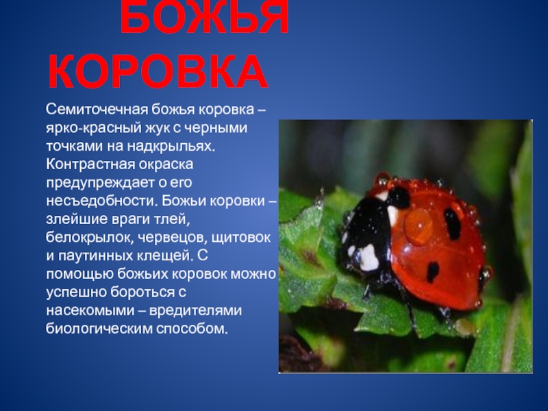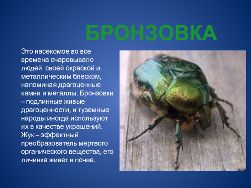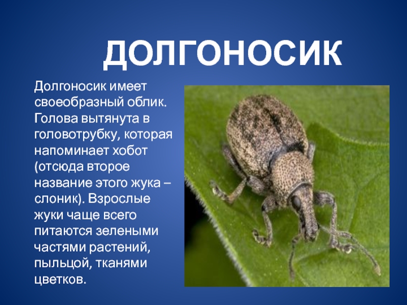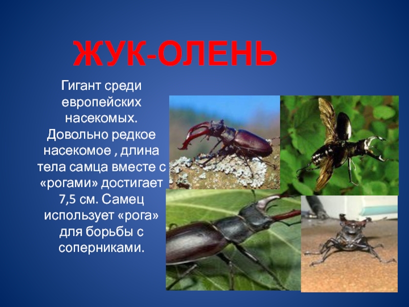 - самый богатый видами отряд насекомых, насчитывающий более 300 тысяч видов. Жуки освоили континенты, заселили все природные зоны от арктических тундр до тропических лесов. В природе жуки являются опылителями растений, разрушителями отмершей органики, контролируют численность других насекомых. Жуками и их личинками питаются насекомоядные птицы, рептилии, млекопитающие .