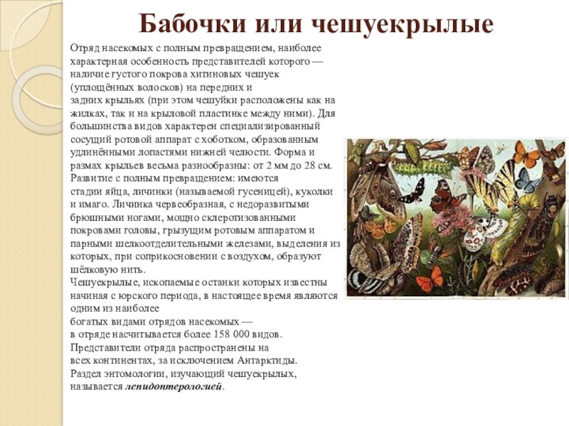 Чешуекрылые, ископаемые останки которых известны начиная с юрского периода, в настоящее время являются одним из наиболее богатых видами отрядов насекомых — в отряде насчитывается более 158 000 видов. Представители отряда распространены на всех континентах, за исключением Антарктиды.