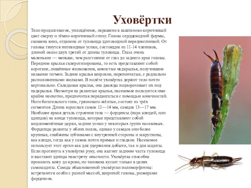 Голова сердцевидной формы, скошена вниз, отделена от туловища щитовидной переднеспинкой. От головы тянутся нитевидные усики, состоящие из 11-14 члеников, длиной около двух третей от длины туловища. Глаза очень маленькие — меньше, чем расстояние от глаз до заднего края головы. Передние крылья склеротизированы, то есть представляют собой короткие, лишённые жилкования, кожистые надкрылья, получившие название тегмен. Задние крылья широкие, перепончатые, с радиально расположенными жилками. В полёте уховёртка держит тело почти вертикально. Складывая крылья, она дважды подворачивает их под надкрылья. Несмотря на развитые крылья, насекомое пользуется ими крайне неохотно, предпочитая передвигаться с помощью конечностей. Ноги бегательного типа, грязновато-жёлтые, состоят из трёх сегментов. Длина взрослых самок 12—14 мм, самцов 13—17 мм.