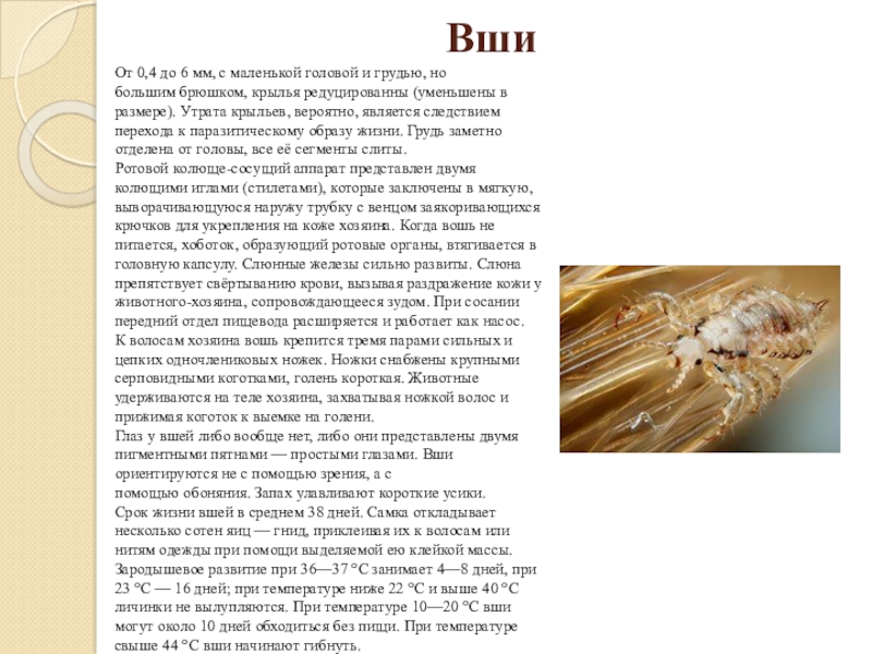 Срок жизни вшей в среднем 38 дней. Самка откладывает несколько сотен яиц — гнид, приклеивая их к волосам или нитям одежды при помощи выделяемой ею клейкой массы. Зародышевое развитие при 36—37 °C занимает 4—8 дней, при 23 °C — 16 дней; при температуре ниже 22 °C и выше 40 °C личинки не вылупляются. При температуре 10—20 °C вши могут около 10 дней обходиться без пищи. При температуре свыше 44 °C вши начинают гибнуть.