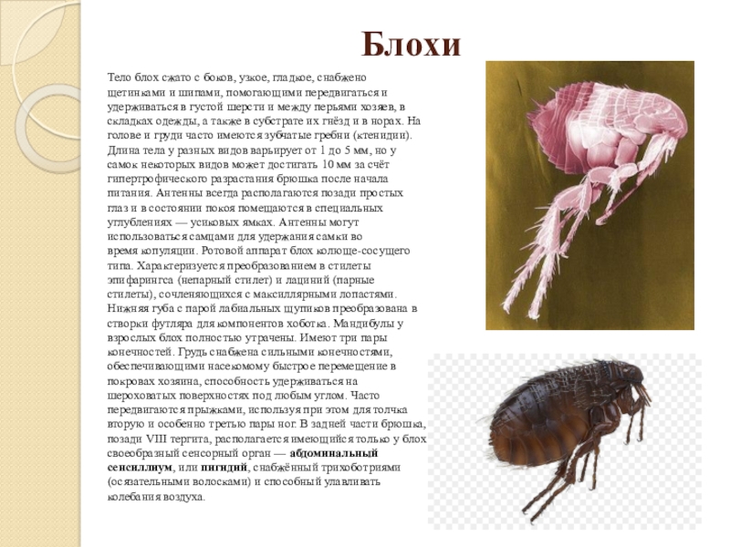 Тело блох сжато с боков, узкое, гладкое, снабжено щетинками и шипами,