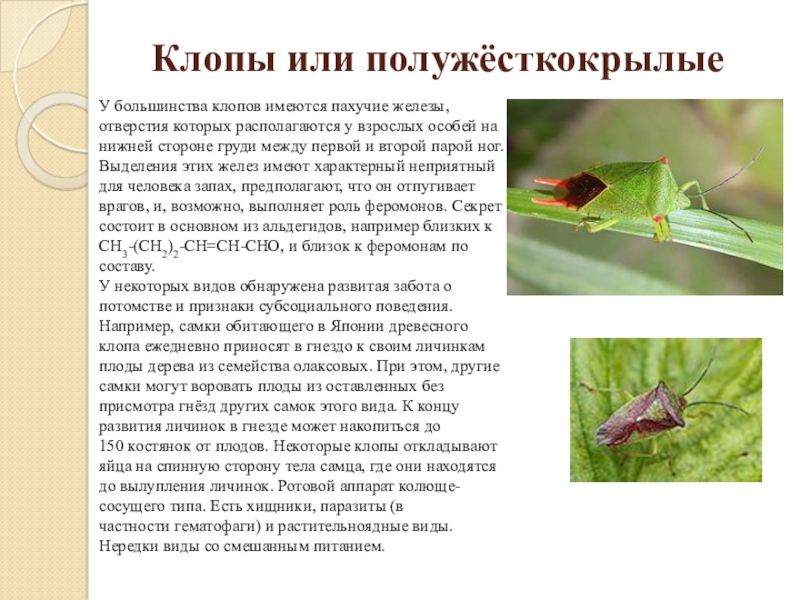У большинства клопов имеются пахучие железы, отверстия которых располагаются у