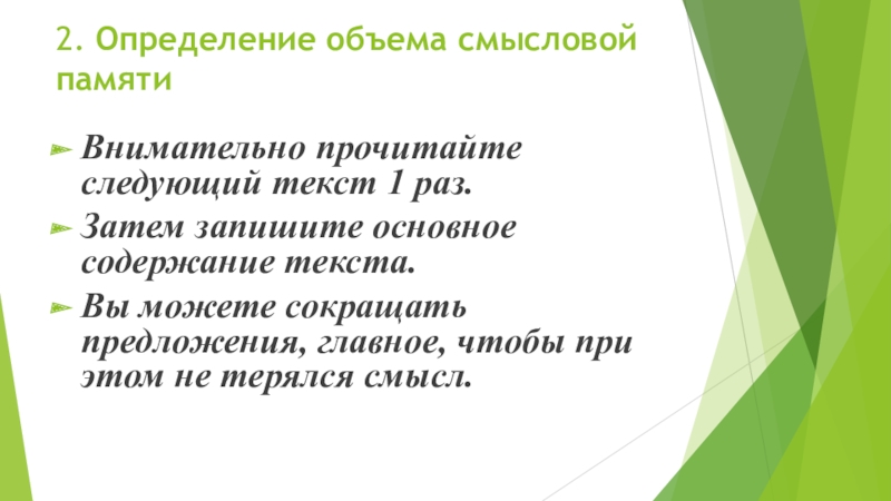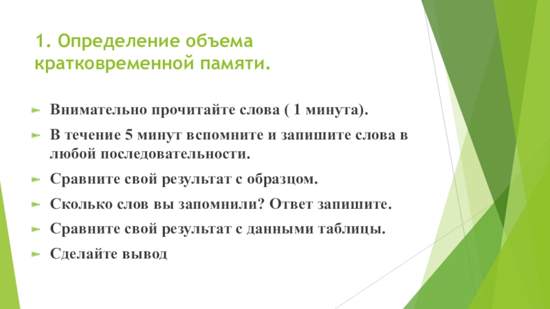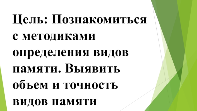 Слайд 8Цель: Познакомиться с методиками определения видов памяти. Выявить объем и точность