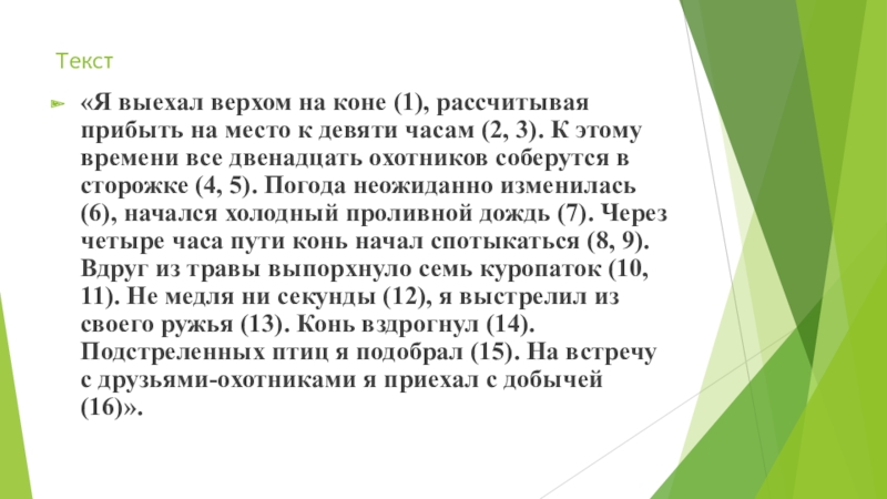 девяти часам (2, 3). К этому времени все двенадцать охотников соберутся в сторожке (4, 5). Погода неожиданно изменилась (6), начался холодный проливной дождь (7). Через четыре часа пути конь начал спотыкаться (8, 9). Вдруг из травы выпорхнуло семь куропаток (10, 11). Не медля ни секунды (12), я выстрелил из своего ружья (13). Конь вздрогнул (14). Подстреленных птиц я подобрал (15). На встречу с друзьями-охотниками я приехал с добычей (16)».