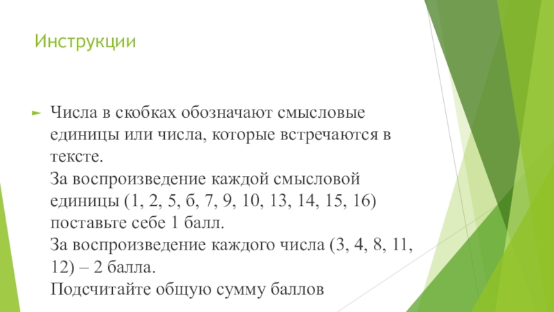 За воспроизведение каждой смысловой единицы (1, 2, 5, б, 7, 9, 10, 13, 14, 15, 16) поставьте себе 1 балл.