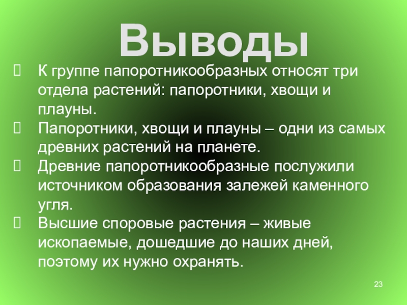 ВыводыК группе папоротникообразных относят три отдела растений: папоротники, хвощи и плауны.Папоротники, хвощи и плауны – одни из